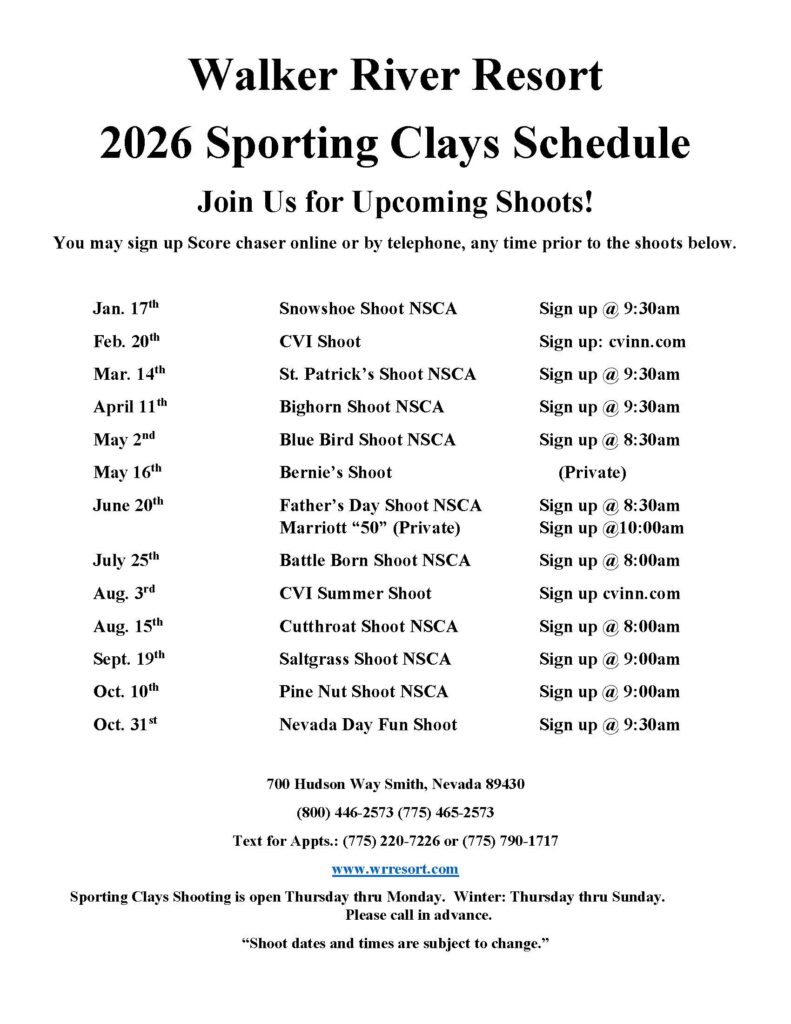 Join Walker River Resort Sporting Clays for an extravaganza of unique targets. Visit us five days a week, Thursday – Monday (April 1 – October 31) or four days a week, Thursday thru Sunday (November 1 – March 31). Open to the Public.